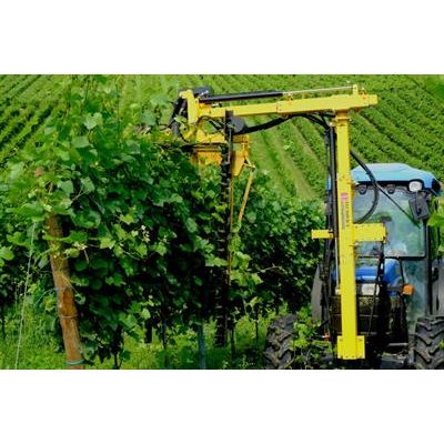 The strong chassis is also protected from the possibility of collision with poles hidden by vegetation, this is possible by using a safety device that allows the rotation of the whole horizontal part of the chassis around a pin placed at the top of the vertical column and its return in position once raised the head and overcome the obstacle. A whisker rubber reference allows the operator to trim safely keeping the canopy equidistant from the centerline of the row. The sidebars uses the tooth-blade system, banner of our company, while the topping is rotary.