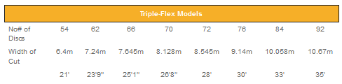 Discs: Front 26" x 8 mm Rear 26" x 6 mm; Optional 28" x 8 mm. Tyres: 13.0/65 x 18 x 16 ply all models (except 54 plate = 900 x 16 x 8 ply). Gang Bolts: 2" diameter all model (H/T). Bearings: Protected greasable gang bearings with triple lip seal. main Frame: 150 x 100 x 9mm RHS. Disc Weight: Approx 120kg.