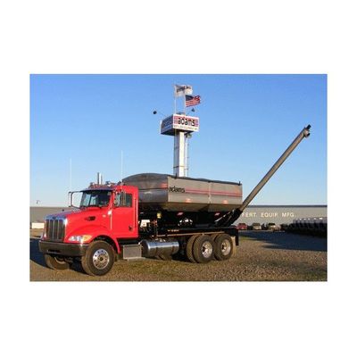 Adams 515t-wla truck mounted tender, 409 stainless steel (304 optional), 515 CU. FT., 4-compartment, 19’ side discharge auger, mild steel auger in stainless steel pipe, adjustable height with hydraulic raise, lower, and fold, manual rack & pinion feed gate and clean out doors, fold down full length walkway, full length fenders with mud flaps and tail lights, tandem hydraulic pump, control valve and roll over tarp.