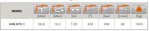Built according "DIN 15018" rule H1-B4 class. Emergency stop button. Wheel-rack slewing system, in oil bath. Shotpeened structure, primer of two components and two painting layers. Continuos rotator and forestry grapple. Maunually extensible and gyratory outriggers. Pre- intallation of 4- function point accesory control.