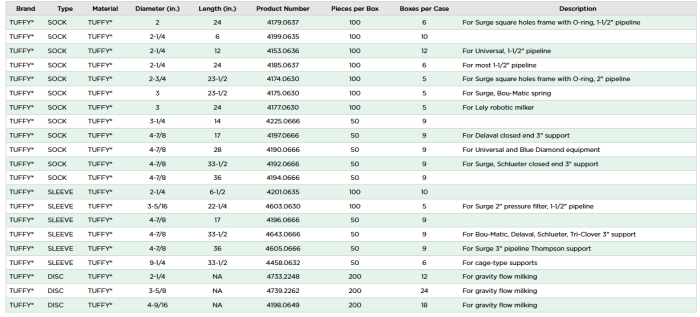 Using our exclusive Tuffy Trap Technology, Tuffy filters capture more sediment than the competition, while maintaining milk flow. More sediment in the filter means less sediment will reach the bulk tank. Available in sizes to fit your equipment, all Tuffy products are FDA compliant and 3-A Sanitary Standards Compatible. No other milk filter can make that claim.