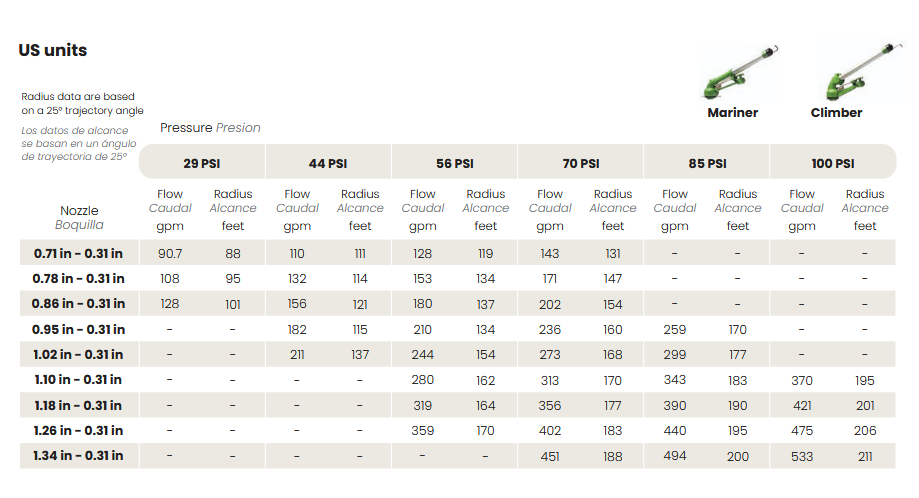 Turbine gun for medium-high flow: Net weight: 10 Kg. Connection: 2” 1⁄2 F. Size: ø 1602 mm x 537 mm. Nozzle: Ø 18 ÷ 38 mm. Angle: 25°.
