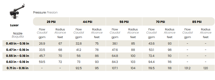 Turbine gun for medium flow. Net weight: 7,2 Kg. Connection: 2” F. Size: ø 1172 mm x 474 mm. Nozzle: Ø 14 ÷ 28 mm. Angle: 25°.