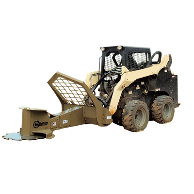 - Pushing Guard: Above the cutting disc gives the operator leverage against the trunks of standing trees, pushing while the tree is still connected to the stump and leaving a hinge to control the fall of the tree away from the skid steer.