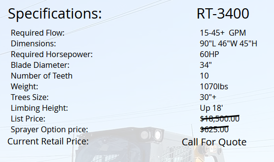 The Turbo Saw RT-3400 comes equipped with a 90 degree hydraulic rotate feature. This allows the operator to rotate the cutting disc from horizontal to vertical for trimming limbs up to 18 foot off the ground.