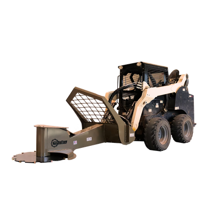 - Pushing Guard: Above the cutting disc gives the operator leverage against the trunks of standing trees, pushing while the tree is still connected to the stump and leaving a hinge to control the fall of the tree away from the skid steer