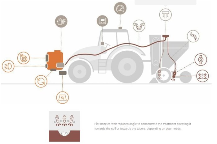 We have developed the STARSOL TWIN/TRIJET kit (two or three nozzles per row) specifically to obtain an optimal protection of the tubers through the localized nebulization directed towards the soil or the potatoes, during sowing, when the furrow is still open.