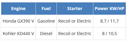 - with GX390 AE engine, wheels 6.5/80-12: 138 kg