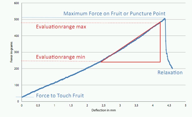 Fruit are compressed according to the max. force procedure. The probe keeps this position for a certain time (maximum1 sec), resulting in an inelastic remodeling of the fruit. This gives a force drop and is detected by the Firmtech.
