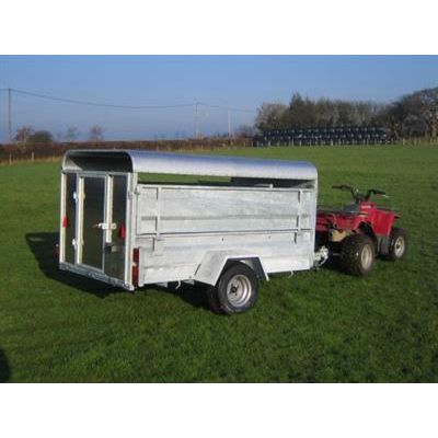 Fully galvanized construction. Single axle. Removable roof. 42" high inside. Drop down / removable sides. Internal dividing gate with two sets of hinges. Extra gates / hinges available on request. Rear loading door in tailboard. 750kg gross weight. Cast Coupling.
