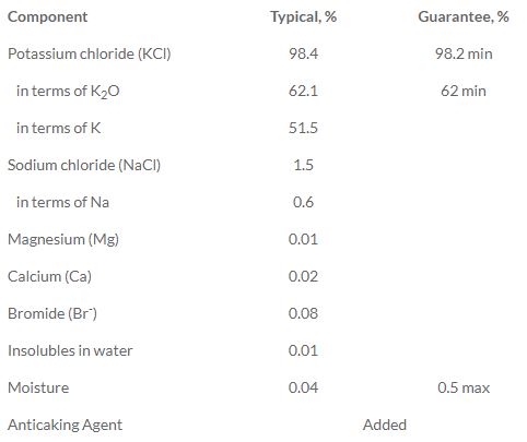 One of the most concentrated sources of potassium. Suitable for use on all soil types for all chloride tolerant crops. 100% solubility in water. High chemical purity. 100% friability.