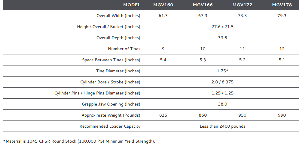 Single jaw grapple designed to handle manure, brush and debris. No cross member for better penetration. High strength replaceable tines. Nitrosteel cylinder rods & teflon coated bushings on hinge.