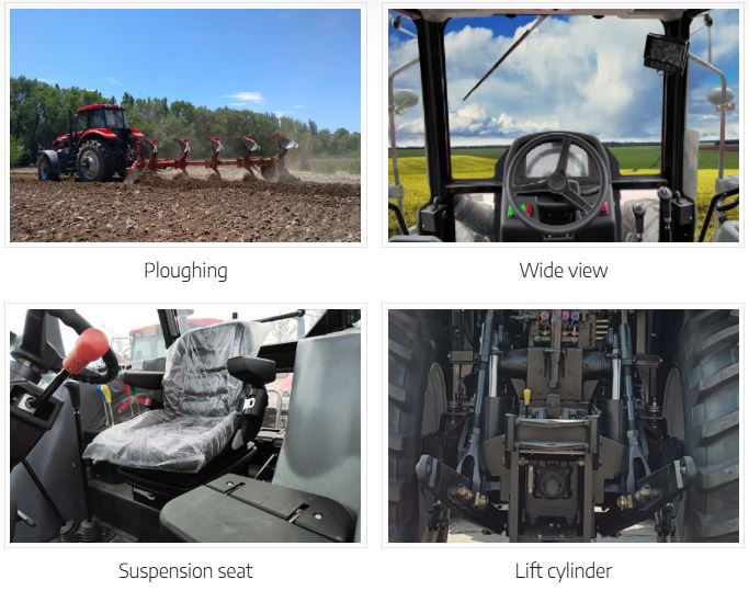 YTO’s tractors are versatile helpers in farming chores as they deliver large traction force and excellent performance. The air-cooled 6-cylindered turbocharged diesel engine features high horsepower and low fuel consumption. Several gears allow for better performance, high fuel efficiency and a smooth operation. The hydrostatic steering unit ensures precise control and requires less operator effort. The wet disc brake greatly improves tractor safety. The one-button design of the electro-hydraulic PTO and the differential lock enables easy and convenient operation. Carraro’s front axle offers the advantages of high reliability and durability. The enclosed cab provides operator a wide view and comfortable experience as it is equipped with climate control system.