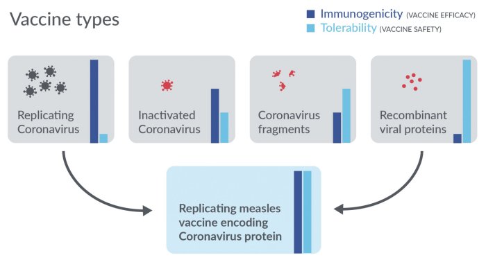 Our measles vaccine vector encoding SARS-CoV-2 antigen has been shown to induce effective cellular and humoral immune responses and may qualify for protection against COVID-19. Balancing immunogenicity and tolerability is key to develop vaccines that are effective and safe. For COVID-19, using a replicating attenuated coronavirus would be highly immunogenic but bears a potential risk of residual pathogenicity. Using an alternative virus vector system with a defined safety profile, e.g. a measles vaccine backbone, to deliver coronavirus-specific antigens eliminates this potential risk but maintains the quality of a multifunctional immune activation.