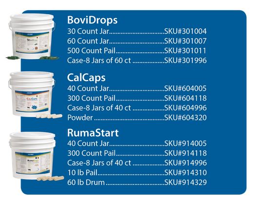The Van Beek Natural Science Fresh Cow Program with BoviDrops, RumaStart and CalCaps delivers a high concentration of vitamins and minerals along with highly available calcium and probiotics to help support reproductive health, stimulate appetite and help maintain the immune system.