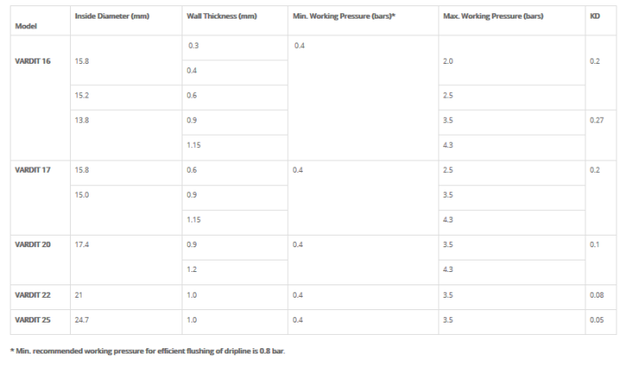 Miniature economical PC dripper to maintain uniform flow rate at wide range of working pressures and variable topography.Expanded inlet filter and wide water passages for clog resistance. Contains the most reliable and proven PC mechanism by regulating labyrinth of ADI and VERED drippers. Suitable for effluent and recycled water. Dripper flow rates: 0.9, 1.2, 1.6, 2.1, 3.4 l/h. VARDIT dripline available in wide range of wall thickness between 0.3 to 1.2 mm. VARDIT dripline available in wide range of lateral diameters: 16, 17, 20, 22 and 25 mm. Filtration system should be at least 120 mesh.