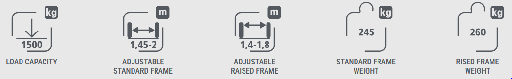 VARIABLE-TRACK TROLLEY TO CONVERT THE SPREADER FROM MOUNTED TO TRAILED. Eurospand spreader and trolley: a winning combination Frame with maximum capacity of 1.5 tons with adjustable tow-eye and supports for connection to different types of spreaders. Available in standard version or with raised frame for late fertilization.