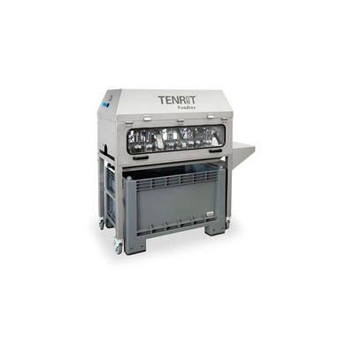 Carrot peeling machine, cucumber peeling machine, radish peeling machine, salsify peeling machine. The TENRIT SOLO C is a vegetable peeler that peels carrots, cucumbers, radishes, salsifies and other elongated vegetables. The product is fed into the machine via a feed table or a V-belt conveyor (optional) for peeling.