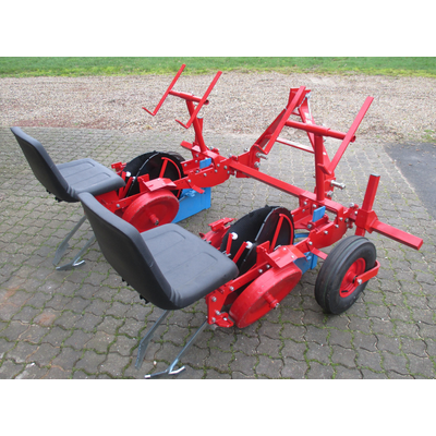 The transplanter includes pressure wheels to maintain correct planting pressure and a seat to provide a comfortable working position for the operator, reducing fatigue and increasing productivity during the planting process.
