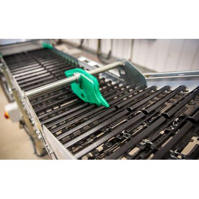 Available in 40- and 55-centimetres widths, it meets capacities up to 45,000 eggs per hour. The smart plastic design of the carriers and smooth connections of the belt, allow a slope up to 35 degrees and small radius corners up to 180 degrees. As only one drive chain is integrated, the Vencobelt is very flexible in every egg room. It has different drive units, meaning it`s suitable for every system length and farm configuration.