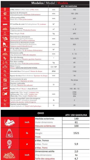 A.T.V. 150 GASOLINE HONDA 22CV - OHIO - forestry chipper. The A.T.V. 150 model equipped with Honda Gasoline engine and two rollers, is a compact and innovative chipper that will fulfil our customer’s requests. It can grind a wide variety of materials (shrubs, branches, debris, twisted wood, trunks and branches) up to 150 mm diameter and offers the best power-production ratio. The A.T.V. model can reach a productivity of 4 – 8 m3/h.