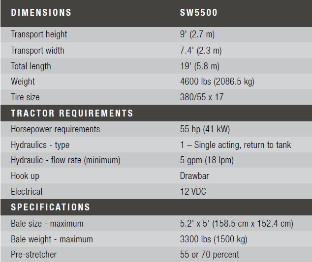 The SW5500 Silage Wrapper is designed to enhance operator conveniences and boost production output and is an ideal system for operations with extensive silage baling work. A rugged, turning table spins the bale. Pre-stretched film tightly wraps the bale, sealing in important nutritional forages. And a heavy-duty turntable, with special ground support bracing, gently lowers the wrapped bale to the ground – ready for storage!