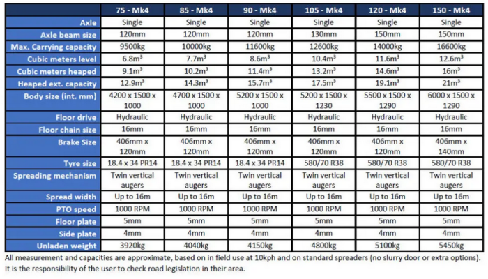 Carrying capacity: 10 tonnes. Cubic Meters Heaped: 10.2 to 12.9m³. Body width 1500mm. Heavy duty fully welded construction. Handles all manure types and other materials.