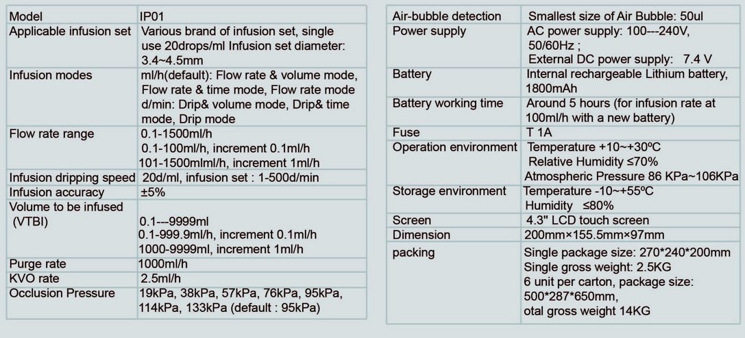 4.3 inch color touch screen for easy operation and clear vision. Compact and lightweight design for easy carrying and mounting. User friendly interface with audible and visual alarm system. Built-in lithium battery, around 5 hours working time after fully charged. Multiple infusion modes to satisfy different infusion requirements. Advanced pressure detection technology.