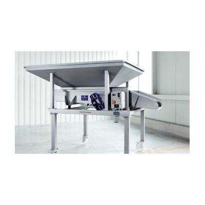 Stainless steel design. Vibration discharge. Easy to clean. Driven by two frequency-controlled unbalanced motors. Four casters (two with brakes).