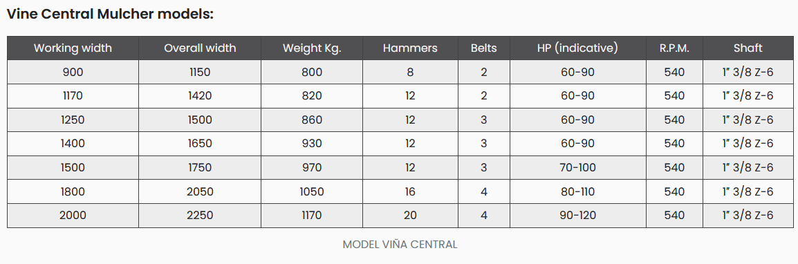The VIÑA CENTRAL mulcher is specially designed to shred all kinds of vine shoots and operates with the tractor in forward drive. Its pick-up feeder passes the vine shoots into the shredding chamber while preventing the entry of any stones. The machine is coupled to the tractor’s top link, allowing it to adapt perfectly to the terrain without the need to use the tractor’s hydraulic pump. Low power absorption. Wheels for height adjustment. Hinged hood offers easy access to the hammers. Very solid and sturdily built. Uniform shredding.