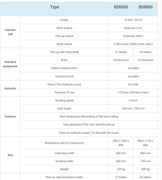 Horizontal rotor shredder composed of 10 hammers and a 27 removable teeth pick-up ensuring a better collecting.