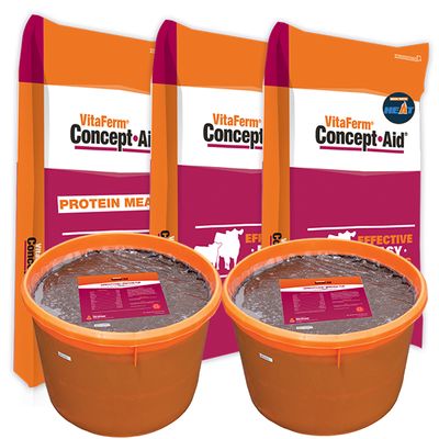 Vitaferm® Concept•Aid® is a line of vitamin and mineral supplements for beef cattle formulated to promote effective, easy breeding when fed 60 days pre-calving through 60 days post-breeding. High concentrations of vitamin E and organic trace minerals, coupled with the Amaferm® advantage, supports quick repair of the reproductive tract and more energy for reproductive success. Additionally, increased nutrient absorption and digestion leads to healthier and heavier calves giving you performance that pays.