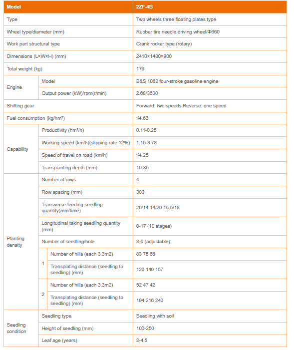 Characteristics: Strong power: New high-power gasoline engine of American B&S is adopted, which has strong power and low fuel consumption. Reliable seedling feeding: The seedling feeding is more accurate and reliable after the crawler and seedling press device improved twice. Strong adaptability: The number of transverse pickup amount can be adjusted to 14, 18, 20. High efficiency: The agricultural machine uses large wheel diameter design to improve field travel ability and work efficiency.