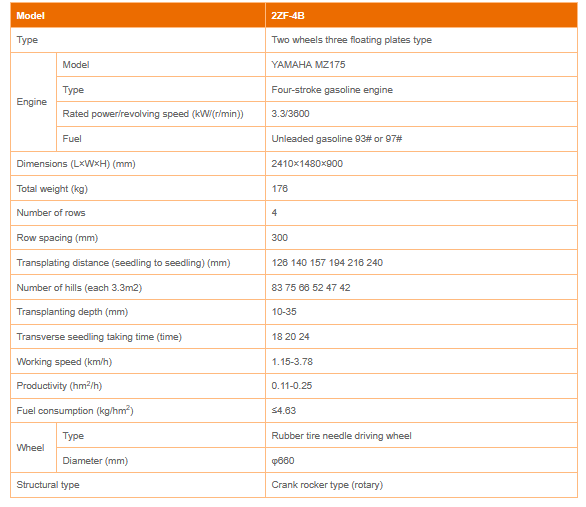 Characteristics: High power: Yamaha MZ175 4.2h.p. gasoline engine is adopted. Reliable seedling feeding: Adopting conveyor to transport seedlings, this rice transplanter has a high ability of sending seedlings and good consistency with the collection of seedlings. Good adaptability: This rice planting machine adopts transverse seedling collection method and can transplant seedling mat. High efficiency: Large wheel diameter design is adopted to improve field travel capacity and work efficiency.