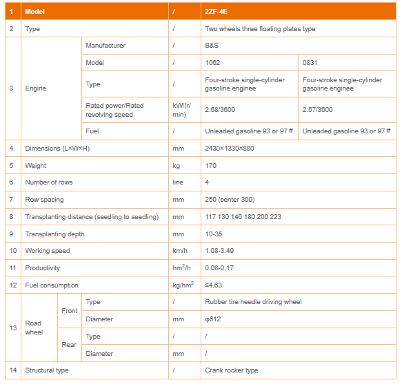 Characteristics: Strong power: Gasoline engine of B&S Company is adopted. Adjustable transplanting distance: The transplanting distance can be changed conveniently in the range of 117-223mm by adjusting the speed setting lever and the transplanting distance adjusting lever. Reliable seedling feeding: The rice transplanter is reliable with a unique structure in seedling feed mechanism. Consistent transplanting depth: Float-type hydraulic lifting mechanism and automatic balancing system makes the transplanting depth consisten.
