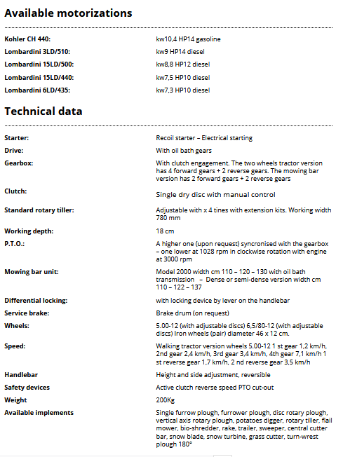 Being so versatile, the Walking Tractor CM80 allows the operator (farmer) to meet the need and the requirements of the activities of the working season, such as ploughing,ridging, milling in order to prepare the seeding bed, weeding, grass and bush cutting, side-delivery raking,potato crop, seeding, snow removal, street cleaning.