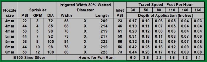 Tube Inner Diameter/Length: .89"x180`. Irrigated Width: 58 - 86`. Irrigated Length: 209 - 223`. Irrigated Area Per Run (Acres): 0.28 - 0.44. Drive System: Electric 110V (Learn More). GPM Range: 3 - 12. Inlet PSI Range: 23 - 73. Hours Per Full Run: 1.1 - 6.0. Sprinkler Included: Sime Silver.