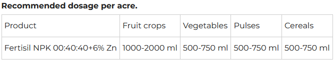 This formulation of Fertisil NPK 00:40:40+ 6% Zn free from Sodium (Na), Chlorine (CI), Nitrates (N03), Sulphates (S04) and Carbonates (C03) hence the harmful effect on the plant foliage and physiological system is mitigated.
