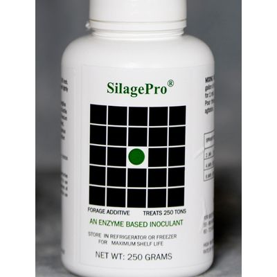 250 Gram Jar: Treats 250 Tons. Min. Order: 1 box (10 Jars). Improves fermentation of haylage, corn silage, small grain forages and high moisture corn. Four cascading bacteria (Enterococcus faecium, Pediococcus pentosaceus, Pediococcus acidilactici, and L. Plantarum) that supplement lactic acid bacteria. SilagePro® enzymes to enhance fiber digestion. Min Lactic Acid Bacteria (Guaranteed): 130 billion CFU/g. Provides in excess 130,000 CFU/g of silage. Water-soluble SilagePro® should be kept in the refrigerator or freezer.SilagePro® was first formulated as an enzyme product to produce an environment where forages would ferment faster and cooler utilizing natural bacteria. Somewhat variable results indicated that natural bacteria alone are not sufficient to provide consistent results. Consequently, four strains of lactic acid producing bacteria were added to the enzyme mixture to provide robust lactic acid production matched to the resulting enzyme activity.