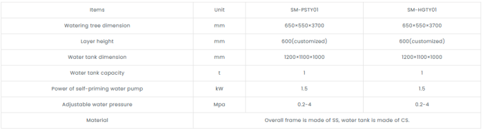 Water sprayer for mushroom cultivation is a durable piece of equipment which is built with ease of use as it can be attached to the side of the mushroom shelves and be guided along or pushed through a trolley. Mushroom Watering Tree can be equiped with one cubic water tank and stainless steel high pressure water pump. The water tank can be plastic or stainless steel material.