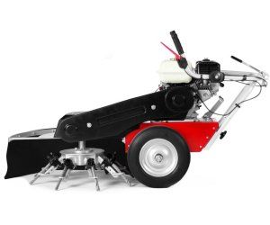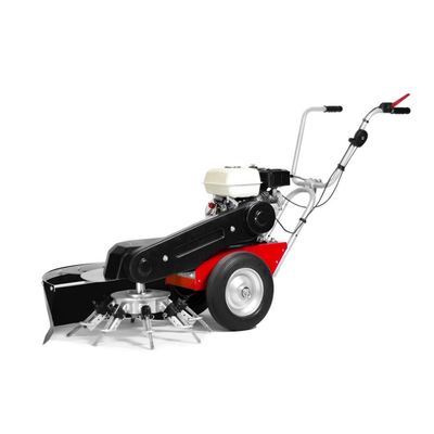 The solid frame in connection with the powerful engine, the big wheels and the handlebar allows a vibration-free working over a long time with hardly noticeable lateral forces. The brushes are individually adjustable. If wear occurs, the brushes can be pushed back by the quick-change system. A wear protection protects the plate damage. A splash guard protect against flying stones and damages. The brush head can be adjusted in the inclination. The handlebar is foldable and stepless height adjustable without tools. Furthermore it can be pivoted to the side.