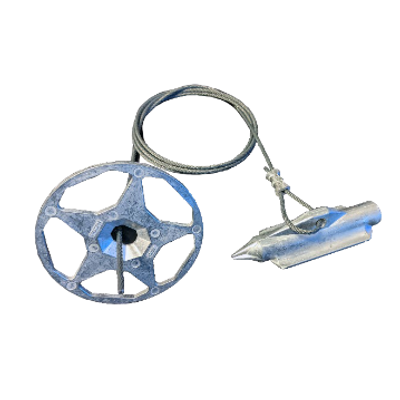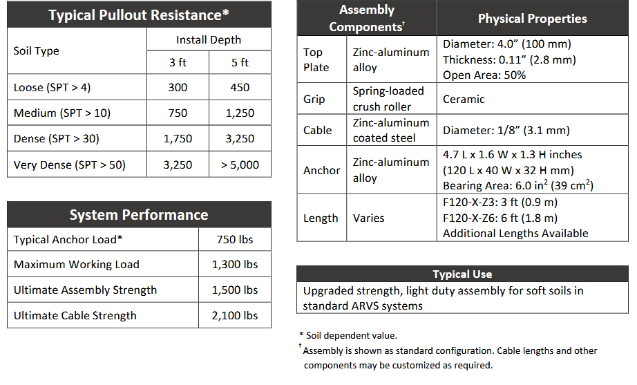 Falcon Percussion Driven Anchors (PDAs) are designed to provide drive efficiency and maximize load capability across a wide range of applications. The F120-X-Z assembly consists of a top plate that allows for vegetation establishment with one-way wire grip, tethered to a deep-seated earth anchor. Once the anchor is driven into the ground, typically 6 feet (1.8 m), the top plate is secured to the ground and held fast, holding an HPTRM or structure firmly in place. The anchor and top plate of the F120-X-Z are cast in the USA. The assembly is fabricated in the USA. The F120-X-Z assembly allows for re-tensioning, negates the need for time consuming cable crimping and comes fully assembled.
