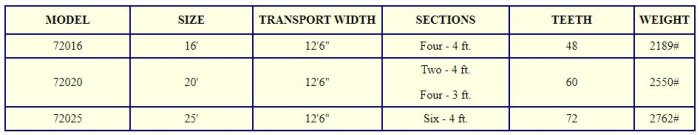 Sections raise hydraulically for easy trash removal and backing up. Sections are easily moved to 90 degrees for transport. Heavy duty tubular frame is reinforced at all stress points. Heavy wear shoes are provided for longer life. Heat treated spring teeth resist wear and breakage. Size of tooth - 1-3/4` x 5/16` x 39`. Teeth require 1/2` mounting bolts. 3/8` holes provided in teeth for replacement points on 2` centers. Sections are joined together with 1` diameter bolts. Jackstand for easier hitching is standard equipment. 15` wheels with large flotation type tires are standard. A rugged adjustable hitch is provided to fit tractor draw bar. 23` tooth bar spacing.