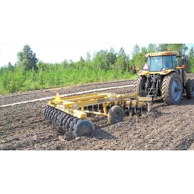 Heavy duty proven design with rugged boxed angle construction welded for maximum strength and rigidity. High gang carrier design to prevent trash build up and clogging. Levels, cuts, and mixes to full working depth. Combines ease of maneuverability with high strength for the most adverse conditions. Up to 277lbs (126kg) of weight per disk blade depending on model with an average of 240lbs (109kg). Up to 9” (229mm) maximum depth of penetration with standard 26” (660mm) diameter disk blades. Equipped with Timken dual tapered roller bearings. Adjustable disk blade scrapers. Dual purpose transport unit for transportability and penetration control.