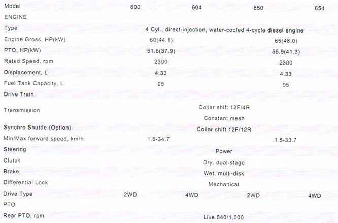 Side shift 12F/4R, Rear PTO 540/1,000 rpm, Dual stage Clutch, Power steering, Safety start switch, Metal hood, Spring suspension seat, Cat.2. 3-pt hitch, AG tires.