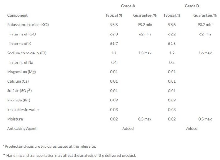 One of the most concentrated sources of potassium. 100% solubility in water. Very low content of sodium chloride. High chemical purity. 100% friability.
