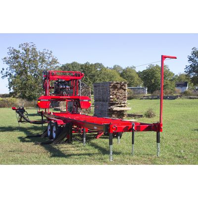 - Hydraulic Log Lift - heavy duty 1/2" thick loader arms make for one rugged log loader. The aggressive foot pattern and deep pocket log holding design allows for comfortable log placement with no fear of logs rolling back off the arms as is common with other designs. Additional solid foot loader stabilizer legs give the sawmill that extra support even when dealing with the heaviest of logs
