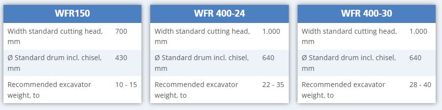 Universal attachment cutters for hydraulic excavators. Double bearing of the cutting heads, large dimensioned hydraulic motor. For excavators in two different sizes. Option: Hydraulic endless rotary drive. Job-specific tuning of the cutter, cutting heads available in various cutting widths and designs. Wide range of chisels / cutting tools.