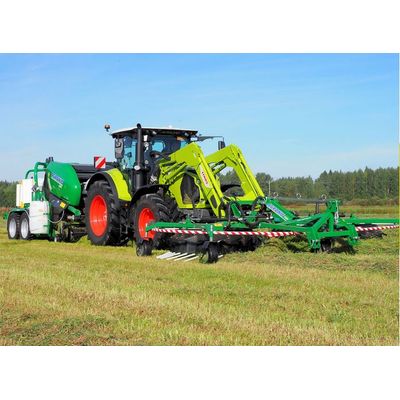 The windrower (rake) can be used to combine two windrows or to windrow tedded hay. It can also be used in combination with a baler or self-loading wagon. The working width is hydraulically adjustable, and the rotors have a hydraulic drive. Bringing into the working and transport position does not require leaving the cab.