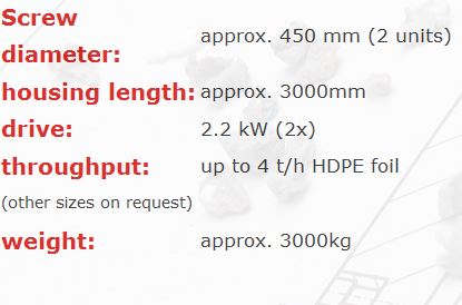 The WiPa separator screw is used to separate impurities from the granulated material. It is furthermore suitable for pre-washing the plastic and soaking impurities to remove them more easily.The material is filled to the bottom of the separator screw and transported to the top by means of two spiral conveyors. During the transport the material is moving very much so that impurities such as stones, sand, glass and metal can easily sink to the bottom. These impurities are pushed out by means of a time controlled discharging system. In addition to this process impurities sticking to the plastic are being soaked so that they can be removed more easily.